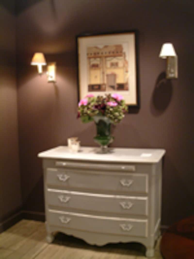 わざわざコンソールテーブルを購入しなくても、チェストなどをコンソールテーブルの代わりにできます。壁紙を深い色にお手持ちのチェストを白く塗装してもよいかもしれません。ブラケット照明の位置などを参考にしてください。