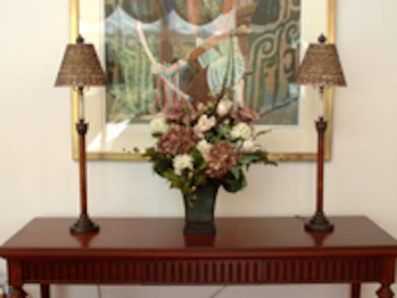 妙に壁が空いてしまったり、絵を飾りたいけど大きさが合わないなど困ってしまったら、コンソールテーブルを使って効果的に壁面を印象づけます。ここではリビングルームのチャームポイントして、コンソールテーブルを上手くつかっています。やはりシンメトーリーに置くのが定番。テーブルスタンドを両側に、絵画に合わせて色を渋めに抑えて、アレンジしたアートフラワーが豪華さを出しています。