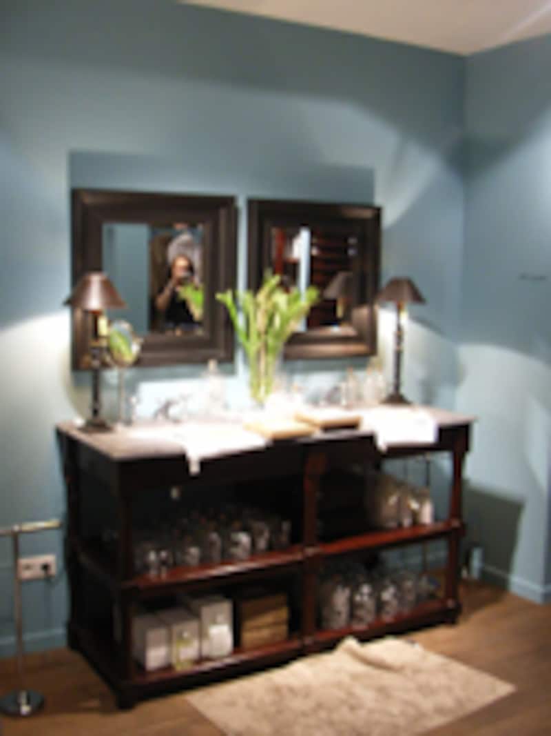 例えば、写真のように、キャビネットがオープンの収納になっていても、コンソール的な飾り棚にすることは可能です。やはり棚上をシンメトリーに整えることでおしゃれな感じがでます。二つのミラー、二つの照明スタンドがポイントです。