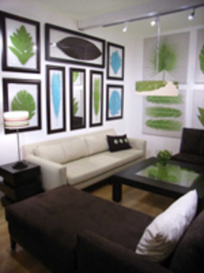 同じ葉っぱのアートですが、フレームがダークブラウンになっています。空間の家具や小物、全てダークブラウンとホワイトの2カラーに絞り、ブラウンを基調としたコーディネートにまとめあげています。落ち着いた雰囲気の中に豊かなアートの表情が生き生きと感じられます。