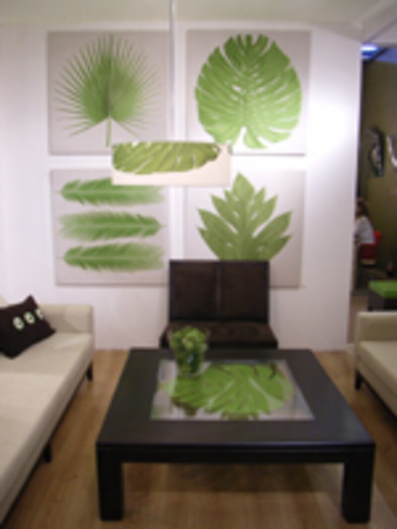 熱帯植物の代表であるモンステラ シュロ フェニックスのアートです。ソファやテーブル、ペンダント照明、クッションもジャーディアンパンプルムース社のオリジナルです。テーブルのセンターに葉っぱのアートがはめ込まれています。