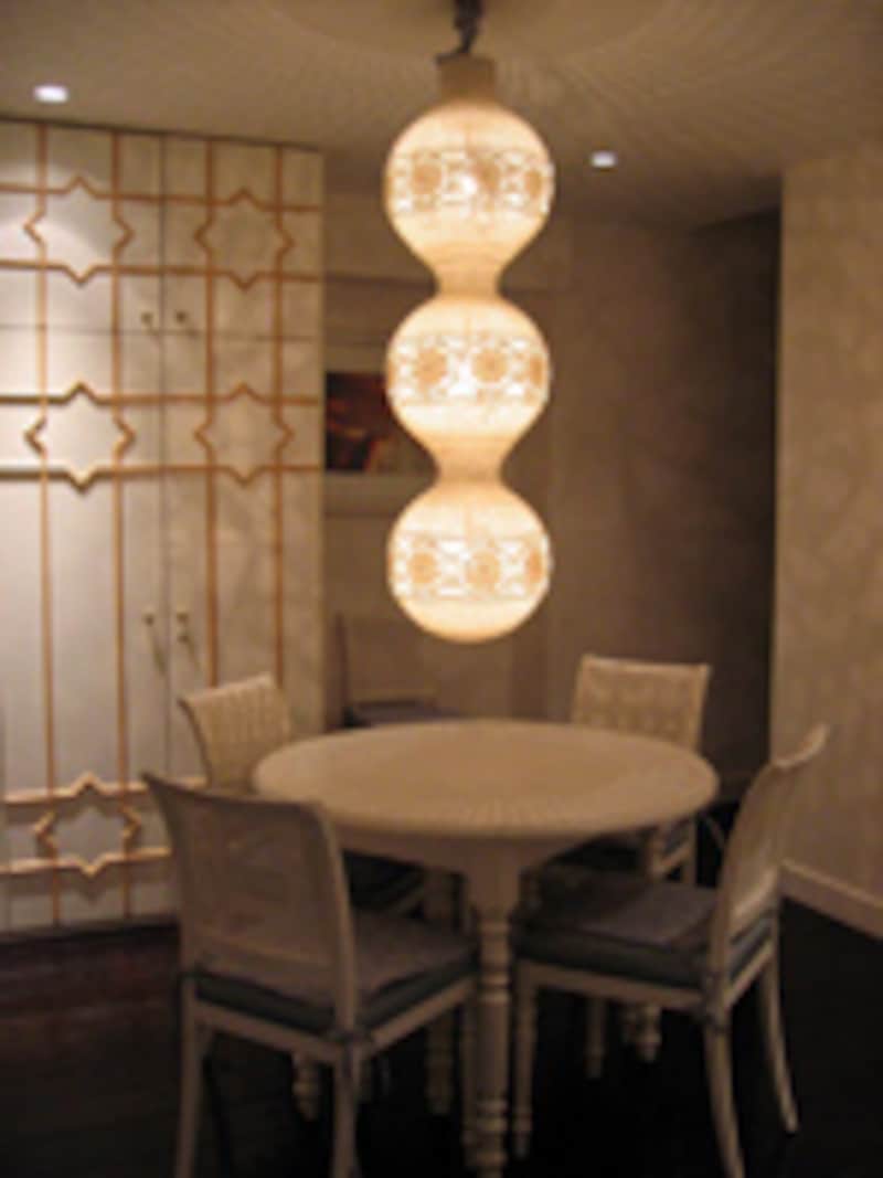 アラブ装飾の象徴、アラベスクの幾何学紋様が美しい壁面です。レース編みで包まれた3連のシャンデリアが不思議な雰囲気で異国情緒を盛りあげます。ミルキーホワイトのテーブルと籐の背をもつダイニングテーブルが空間には優しい空気をもたらします。