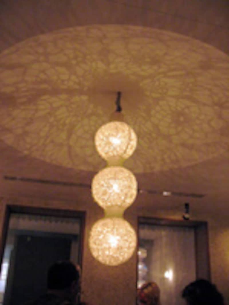 白い空間に浮かぶ天井、シャンデリア照明から漏れる光が影を落とし、幻想的な雰囲気を作りだしています。シャンデリアはグローブ球をレース編みで包んだもので、あまりに奇抜なアイディア、ともすると陳腐に見えるはずなのですが、アラブ空間にはピッタリ、アラブのエキゾチックで甘美な民族舞踊のベリーダンスの色気さえ感じます。