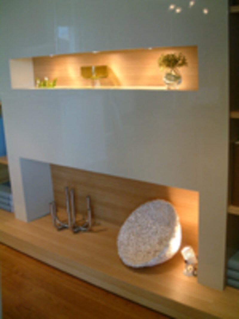 白い壁面収納のニッチ(壁の凹み)にはライティングが隠されていて、棚の中のオブジェが美しく輝いて見えます。下段に置かれたランプにも注目してください。簡単に光を当てる角度が調節できる置き型の照明器具が使われています。