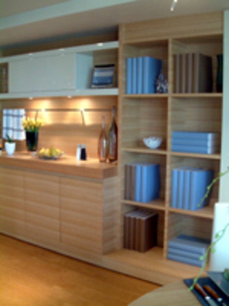木目が美しい壁面収納です。ダイニングからキッチンまで延ばされてる収納家具は、ゼブラ模様の木目が美しく高級感があります。しかも、システムキッチンも同じような面材が使われていて一体感があります。さすがモデルルーム、棚の中の本までがブルーとブラウンで統一されています。このような、小物使いのカラーマジックがいっそう空間の爽やかさを増しています。