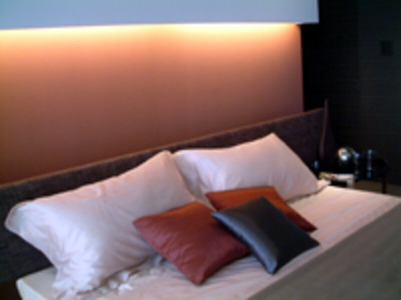 壁の内部に仕掛けられた間接照明が、ベッドヘッドの周りに光と陰のエリアを作り出し、眠りの空間をやさしく包み込みます。ワインレッドのクッションが指し色として使われています。