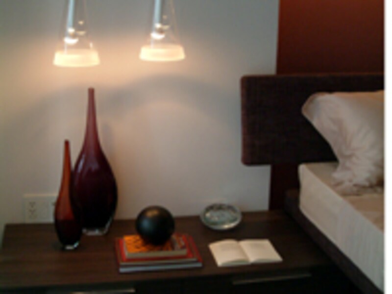 ダークブラウンのベッドサイドテーブルに置かれたミズラ・エメの小物たち。天井から下げられ低い位置にあるペンダント照明に注目!このペンダントのライティング効果も、ベッドルームに光と陰を作りだしています。