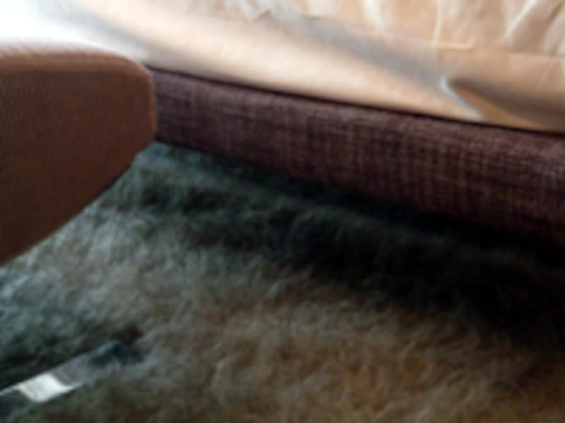 マスターベッドルームのカラーはワインレッドの濃淡で構成されています。ベッドヘッドとベッドベースは鈍いワインレッドの濃淡で織られたざっくりした布で作られています。もちろんシーツも薄いピンク。カーペットはグレイッシュなワイン色の毛足の柔らかいものです。