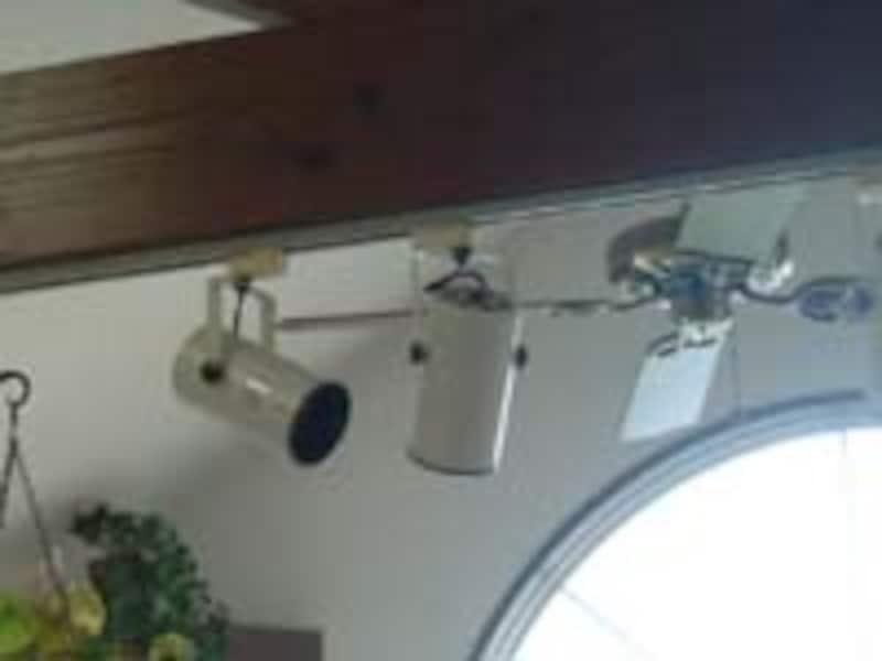 階段の吹き抜けに取り付けられた照明器具。天井の懐がないので梁にスポット照明が取り付けられ、デスク面を明るく照らしています。