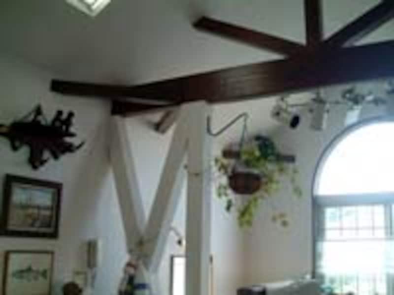 デスクの上部空間です。階段の上の吹き抜けには天井がなく、梁や構造体をインテリアとして見せています。塗り分けられた梁は、素朴でカントリースタイルにピッタリ、大きな窓から光が注がれ、火打ち梁に置かれたグリーンもカントリーな雰囲気を盛り上げます。