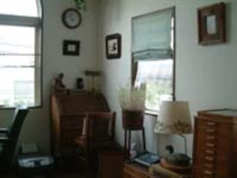 「温もりのアメリカンカントリー」の記事でご紹介したご夫妻の仕事場のエリアです。どう見てもカントリースタイルに不釣り合いなパソコン機器を絶妙に配置することによって、癒しの空間を作り出しています。そしてなんといっても、小気味よく並んだこだわりのアメリカンカントリーの小物たちが、パソコン機器の存在を目だ立たないようにカバーしています。