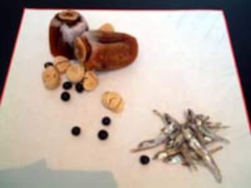 ●五万米(ごまめ)(田作り):ごまめは小殿腹(ことのばら)ともよばれ、子孫繁栄を願うもの。