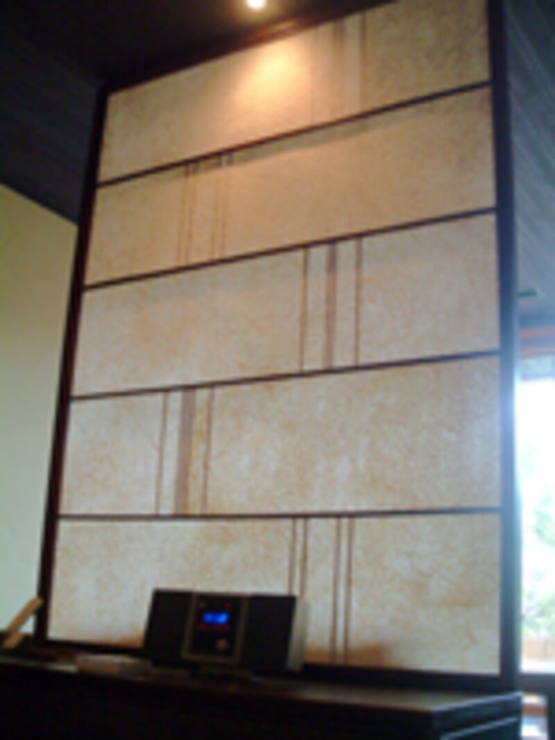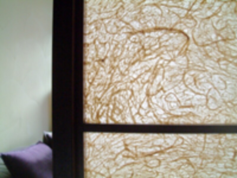 この間仕切りに使われている和紙は、楮(こうぞ)の繊維がそのまま漉き込まれているので、野趣あふれる力強さが感じられます。もしこの和紙が普通の障子紙だったら、優しくふわっとした感じになってしまいます。ゲストルーム全体のインテリアティストは、和と言ってもナチュラル風ではなく、かなり迫力ある和になっていますので、普通の障子紙ではティストが少しずれてしまいます。たった一枚の紙にもデザイナーの感性が感じられるところです。
