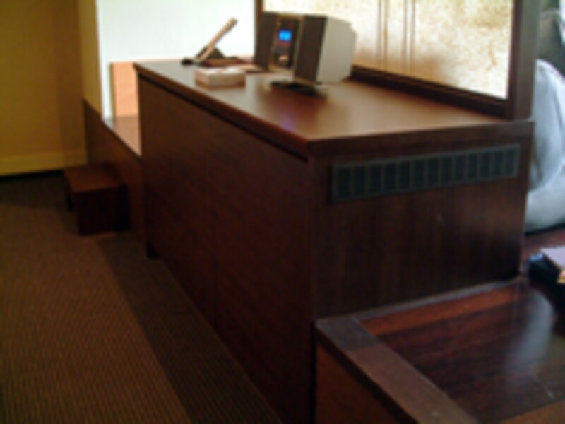 くつろぐエリアの床座は寝室の床より50センチほど高くなっています。電話とCDプレイヤーが置かれている家具は間仕切りとして、また内部は冷蔵庫や食器入れとして使われています。
