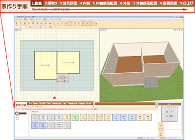 Shade ドリームハウスで家を建てるには、「家作り手順」の左から順に操作していくだけです。