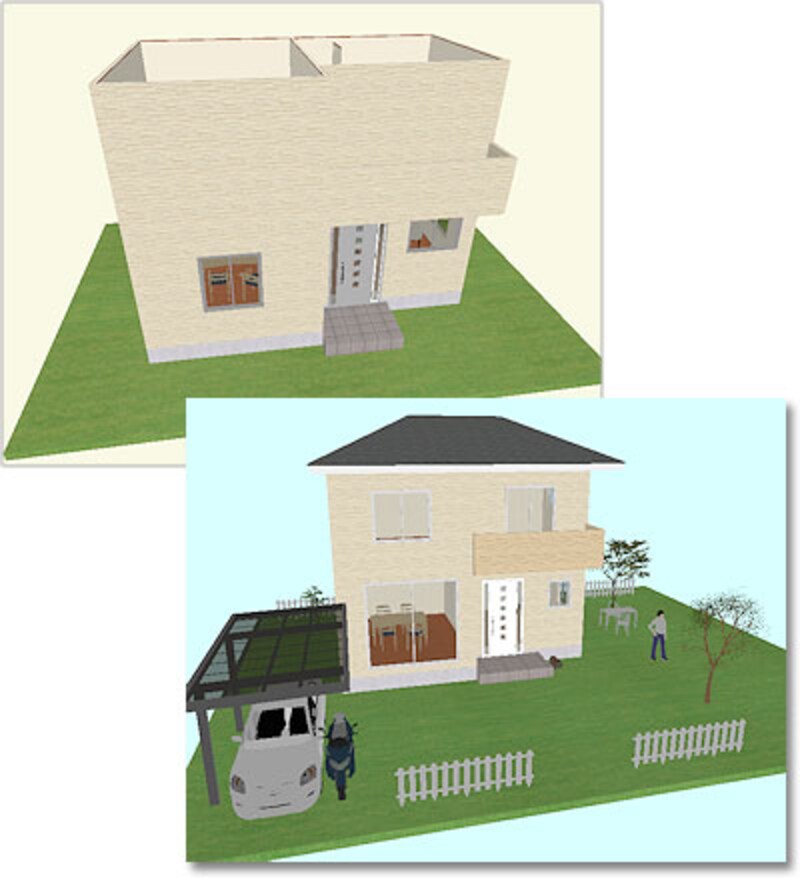 | 敷地を作る→間取りを図面に配置→建具、内装などを整える→外装を選ぶ→屋根を付ける→環境光や背景を選ぶという流れです。 |