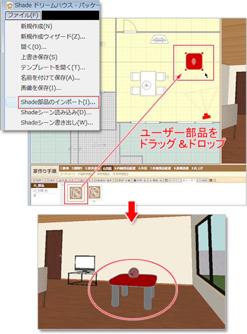 | 「ファイル」メニュー→「Shade部品のインポート」から、Shadeで作った部品を「ユーザー」タブに取り込み、そこから部屋にドラッグ&ドロップします。 |
