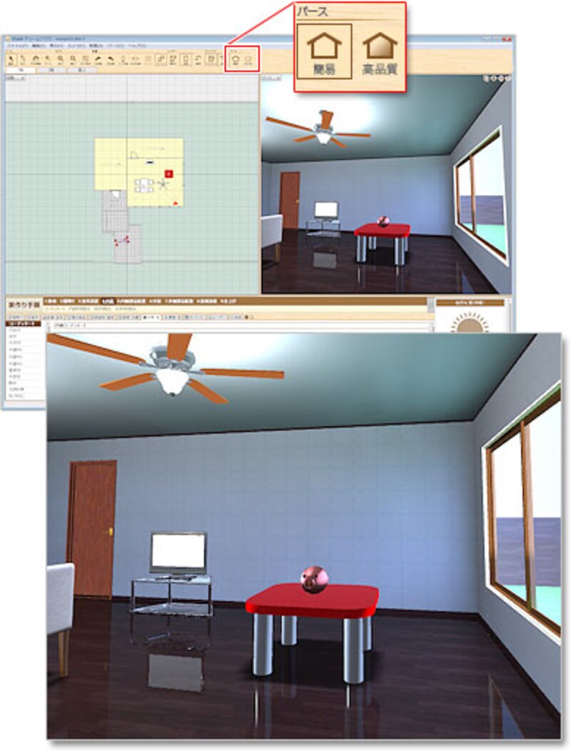 | 「高画質」で見ると、金属などの光沢や、床への映り込みなどがとてもリアルです。 |