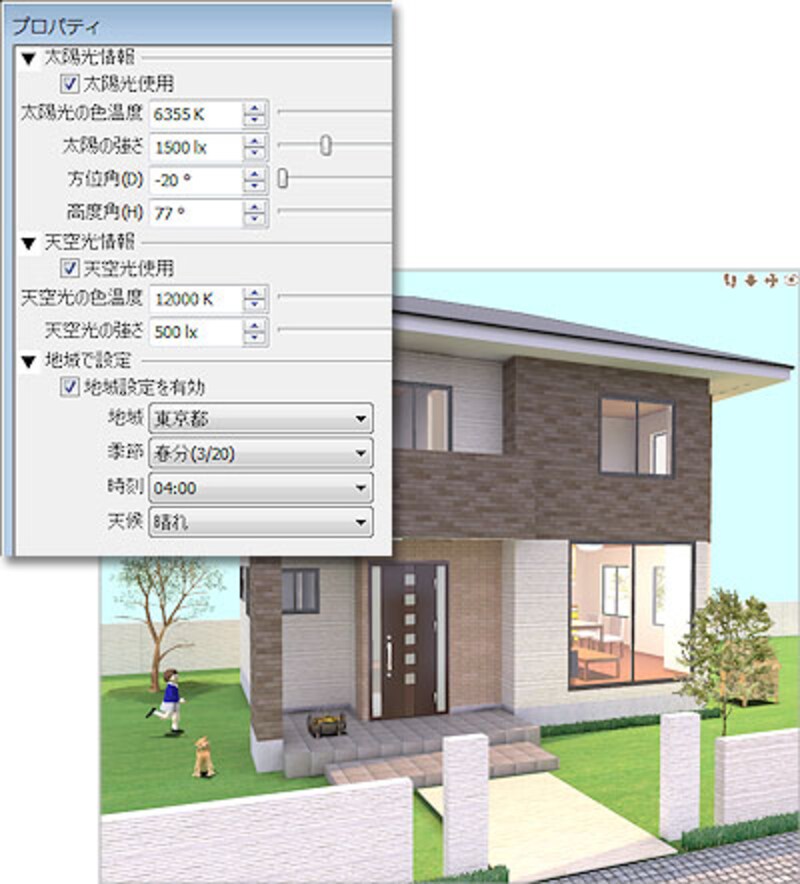 | 自然光のプロパティ。「地域で設定」ではその住宅の地名を選び、季節や時刻なども設定できます。 |