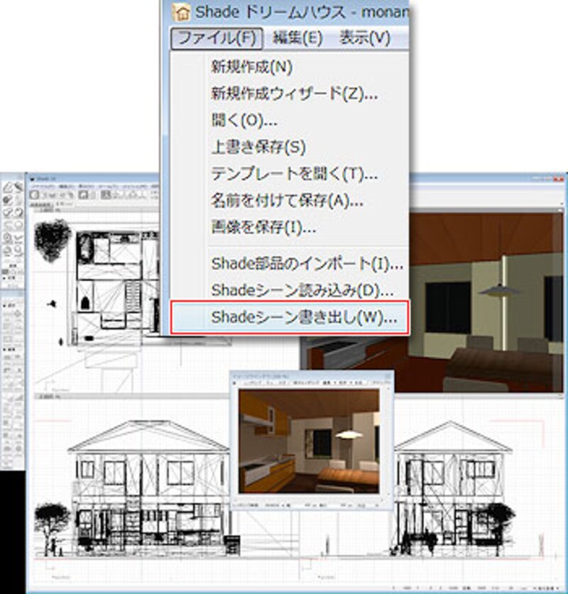 Shade ドリームハウスで作成した住宅データは、Shade 10.5でも開くことができますので、プレゼン用の資料作りなど、さらに細部にこだわったデータを作ることができます。