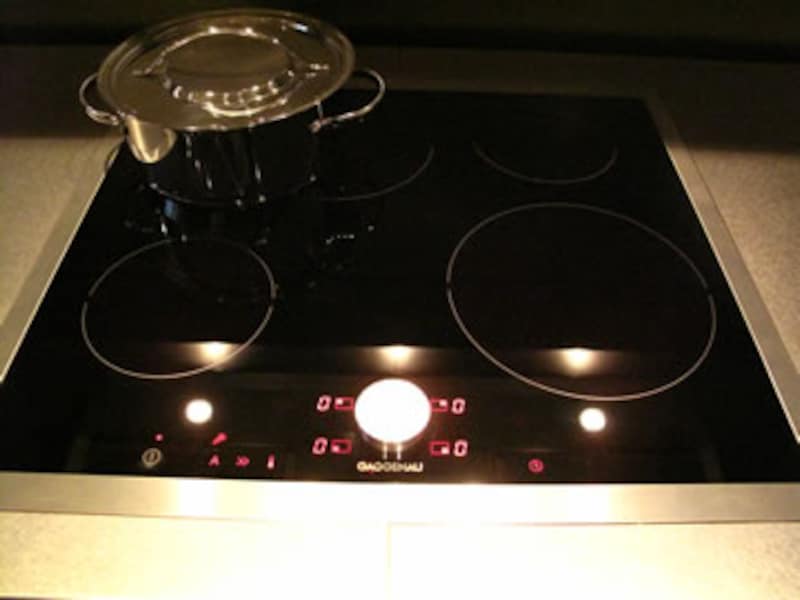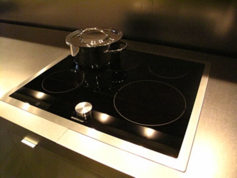 4口IHクッキングヒーターCI261(単相200V-6.0kw・税込¥367,500) 。このIHクッカーが一番面白いのはマグネット式の操作ツマミだ。電源を入れて操作ツマミを使いたいIHの上に置くと下図のようにスイッチが入り強さのコントロールができる。世界初のこの方式は必要のないときツマミを引出しにしまっておけばトップはすっきりするし、小さな子供のいる家庭でも安心して使えるのが特長だ。