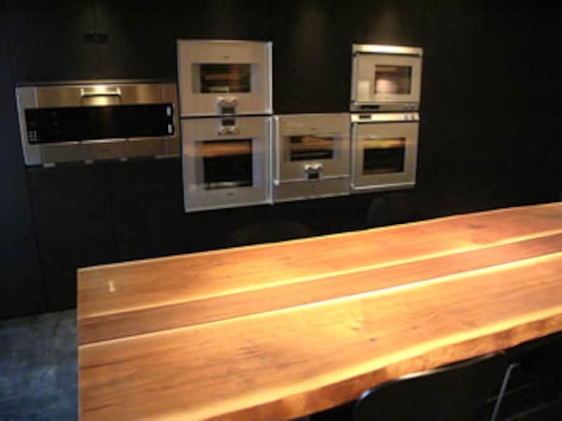 ショールーム手前には、オールステンレス製のキッチンキャビネットがあり、gaggenauのビルトイン機器の組込み例がみられるようになっている。