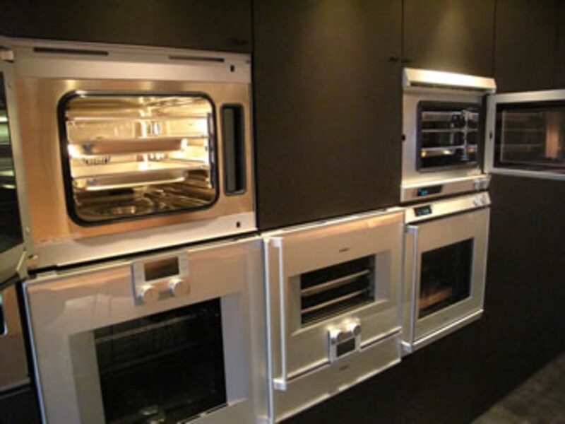 gaggenauを世に広めた一番有名な商品が、左端の90cm幅ビルトインオーブンEB385-410(単相200V-4.85kw・税込¥997,500)。50度~300度まで5度単位で温度調節を微妙にできるのが特長だ。