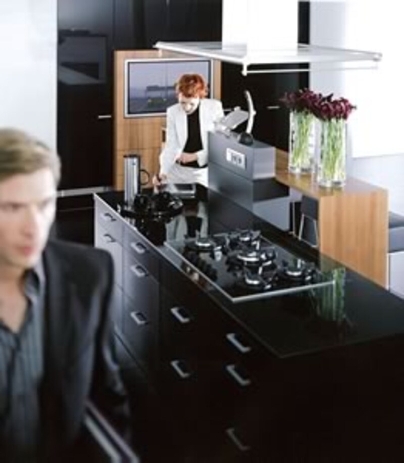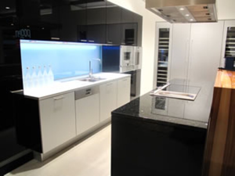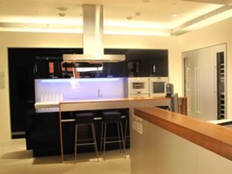 UV鏡面塗装仕上げの純黒の扉がハイエンドイメージを強調する。Gaggenauの最高級ビルトイン機器がフル装備されたキッチンの概算価格は2,230万円。天然石トップのアイランドキッチンキッチン(L=2,400mm×W=840mm×H=860mm)と、ガラストップのキッチン(W=4,200mm)、右手壁面にはW=450mmのワインセラー2本とW=1200mmの冷凍冷蔵庫がビルトインされている。