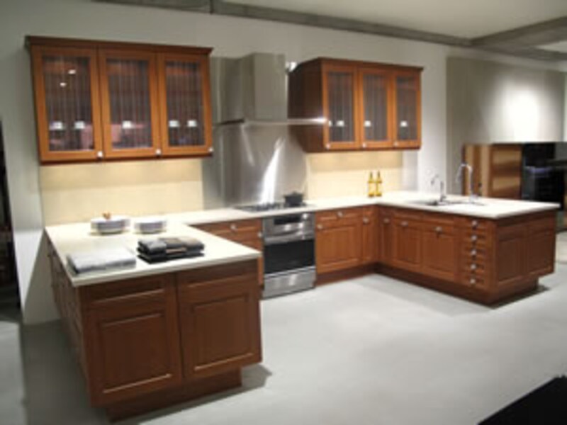 飽きのこない無垢材フレームの扉は、トラディショナル且つモダーンなデザインが売りだ。U型レイアウトのキッチンは3,600mm×2,100mm×2,100mm×H=850mmの外形寸法。概算価格1,570万円。