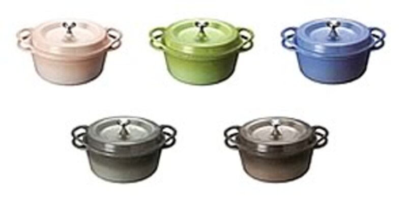 カラーバリエーションは世界初の"パールホーロー”の全5色(パールピンク、パールグリーン、パールブルー、パールグレー、パールブラウン)がある。バーミキュラのピンク色も金をカラーコート層に使っている。