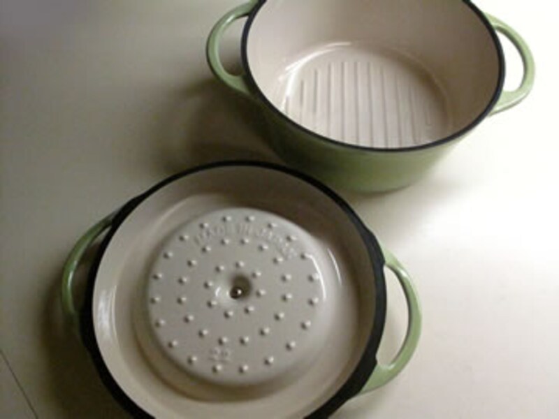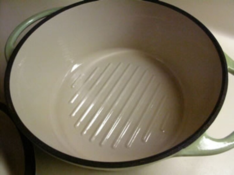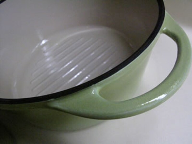 他の鋳物ホーロー鍋には見られないのが、この鍋底のリブ形状。肉や魚にあらかじめ焦げ目を付けてから煮込めば、できあがりに美味効果が期待できる。