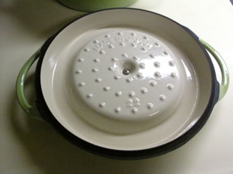 蓋の内側には、他の鋳物ホーロー鍋同様のドットの突起があり、旨味成分や栄養分を含んだ水分が循環し濃厚なエキスを逃さない。