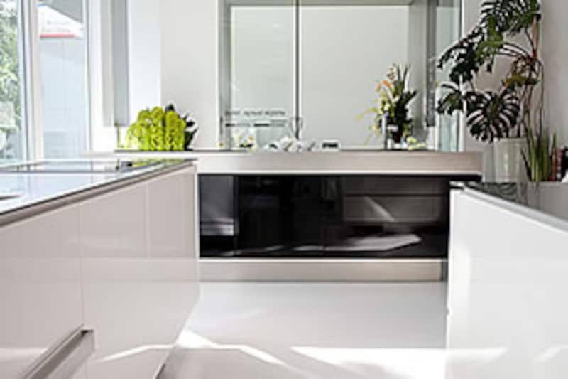 厚さ6mmというステンレスのムク板、純白と純黒の高質なエナメル塗装、シックな濃い木目、これだけのシンプルな素材でダイナミックに構成されるのがamstyleという名のスタイルキッチン。7月24日におこなわれたamstyle loungeのプレス発表会に参加してきました。