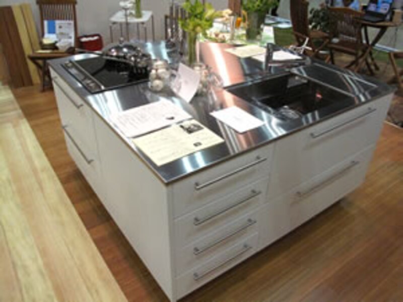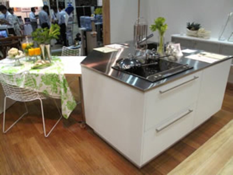 理想の住まいのキッチンは、大阪に本拠を置く「スタディオン」のオーダーメイドキッチン。五角形のアイランドキッチンにダイニングテーブルが配置され、料理と食事を楽しむ演出。
