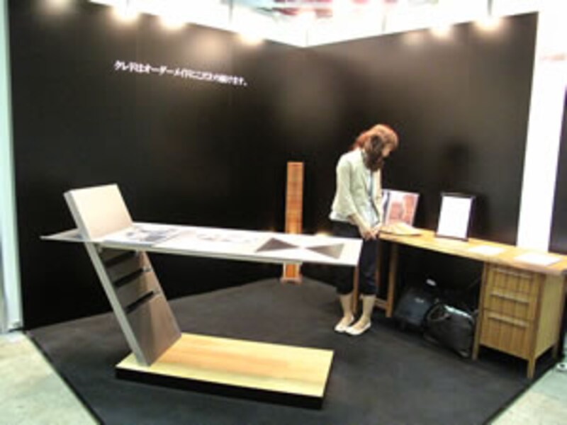 オーダーメイドキッチンCREDOのブースは、東京デザイナーズウィークに出展した高さがアジャストできるカンティレバー・キッチンのコンセプトモデル。