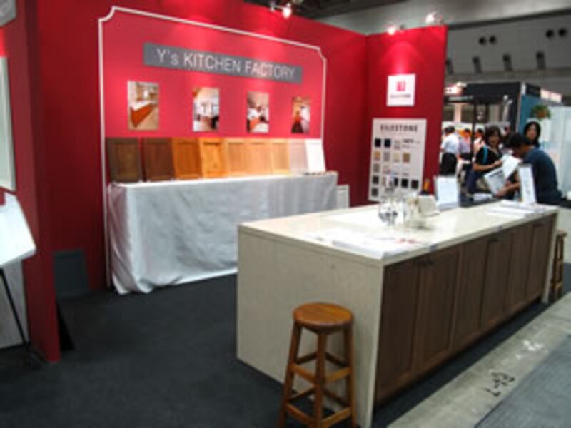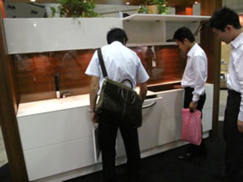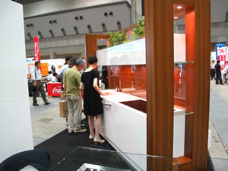 新宿OZONE7階にオーダーキッチンショールーム「ハウゼ」を運営する「Les arc」のオーダーメードキッチンは、シンプルでダイナミックな構成に人気が集まっていた。