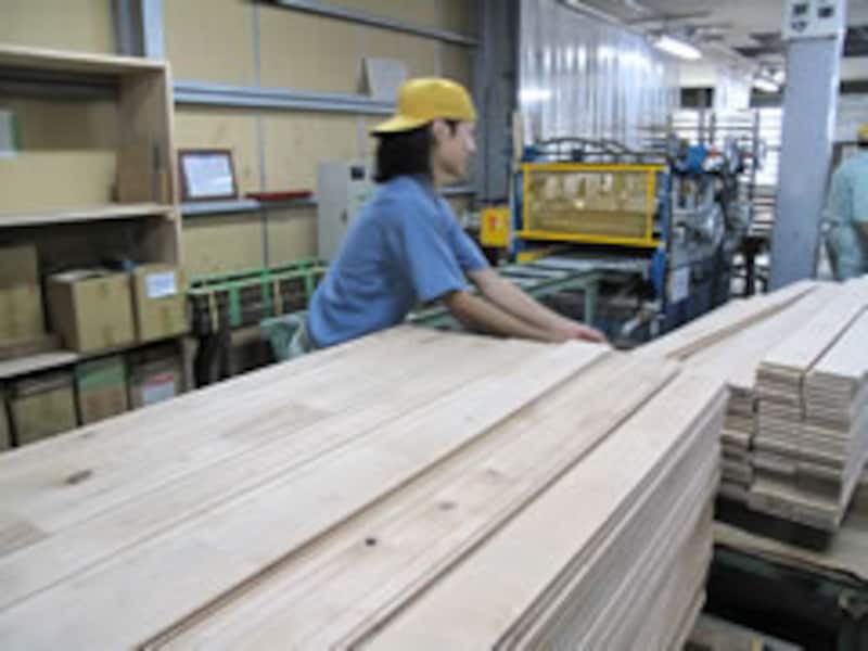 フローリング材の塗装工程。従来のウレタン塗装から脱ホルム塗装への変換が進んでいる。