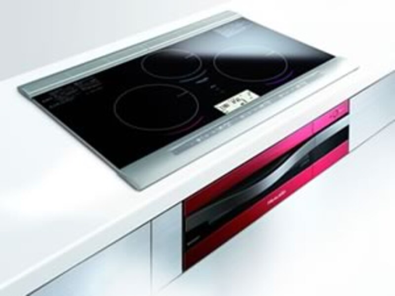 「ヘルシオIHセンター」は、上の写真のように75cm幅ワイドトップタイプと60cm幅トップタイプの2タイプと、トッププレートカラーがブラックとホワイト、前面のヘルシオ部がレッド系とシルバー系の合計6モデルが発売されます。