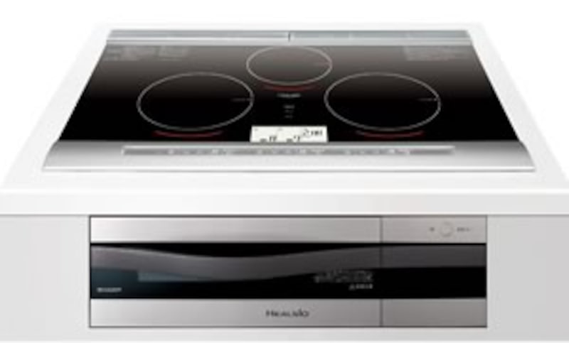 「ヘルシオIHセンター」は、上の写真のように75cm幅ワイドトップタイプと60cm幅トップタイプの2タイプと、トッププレートカラーがブラックとホワイト、前面のヘルシオ部がレッド系とシルバー系の合計6モデルが発売されます。