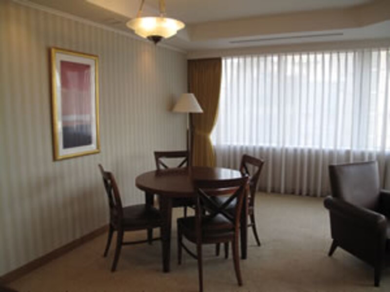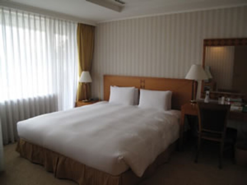 マスターベッドルームには、TVボードやドレッサーが配置されている。サービスアパートメントの一番嬉しい点は、リネンサービスやベッドメーキングが頼めることだ。隣りの寝返りが気にならない、キングサイズのダブルベッドのスプリングは高級ホテル並み性能だ。