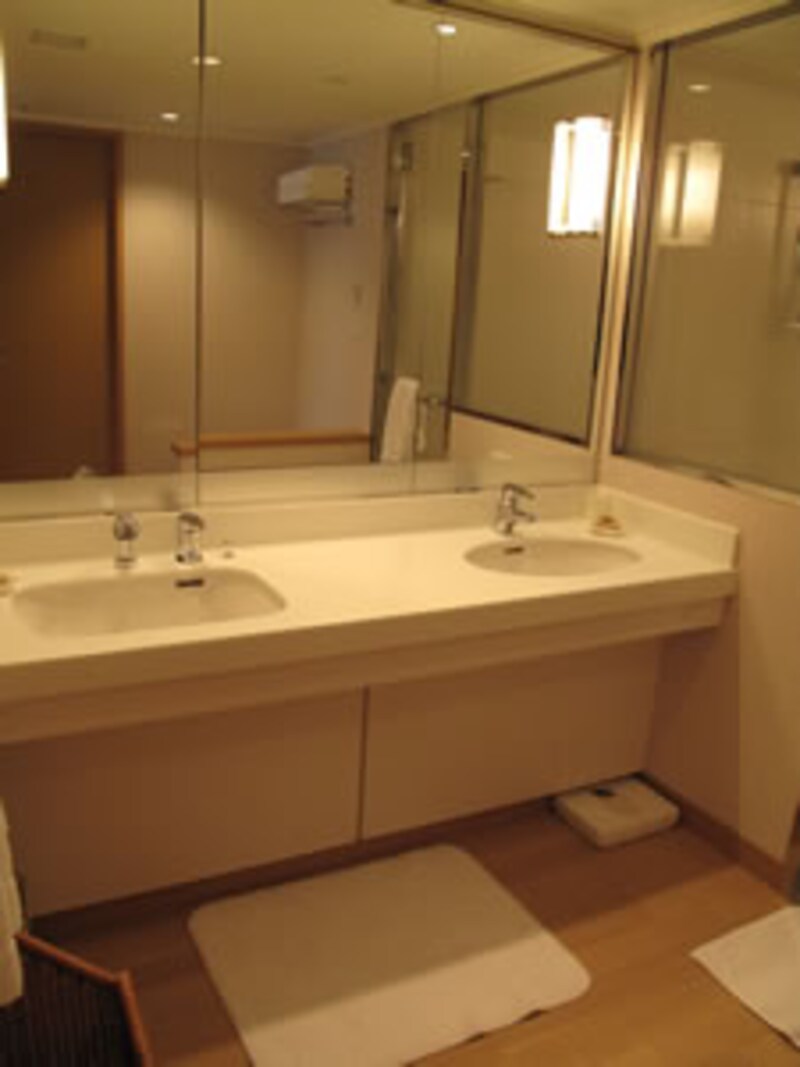 マスターベッドと廊下からツーウェイでアクセスできるバスルームには、2100幅の大型洗面化粧台。角形と丸形のボウルがゆったり配置されている。