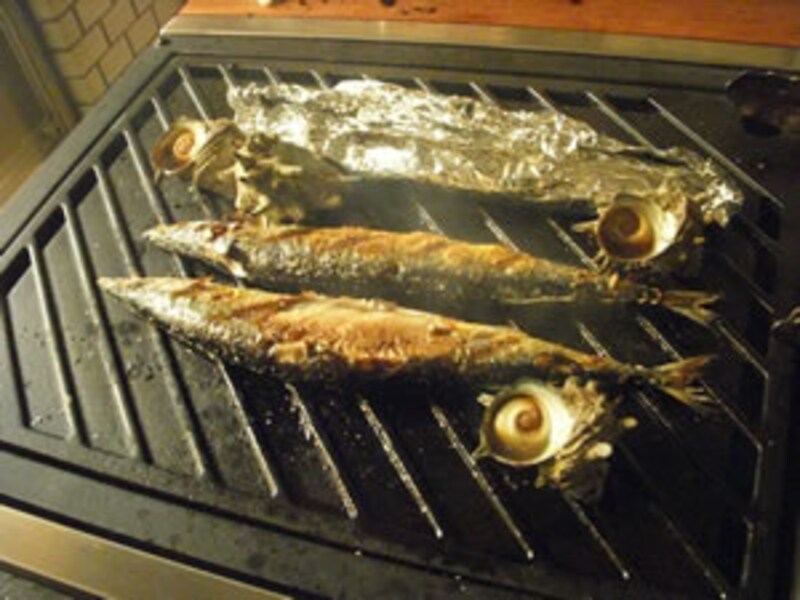 旬のサンマも旨く焼けるが、最初はこのように、皮がプレートから剥がれず失敗。