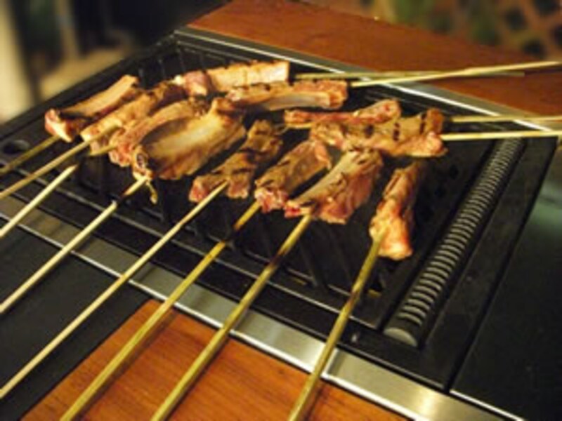 ポークリブは、特製ソースにつけて竹串に刺して焼く。