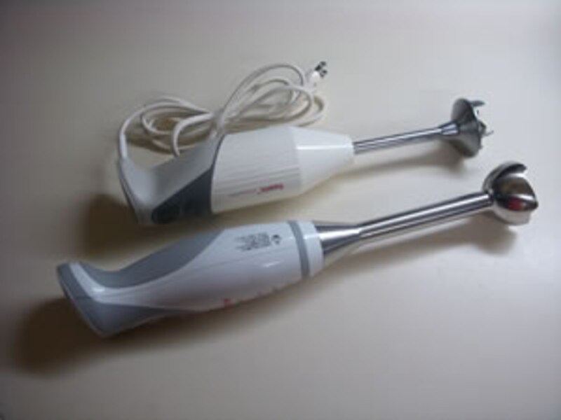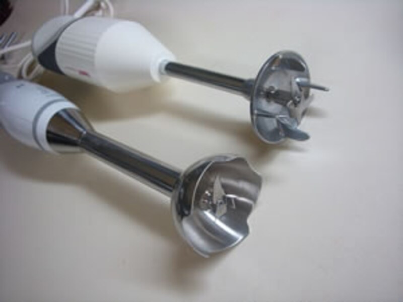 上がバーミックスで4種類のカッター刃の交換ができるが、長年使っている間に緩んでくることがある。また鍋の中で使うと食材が回りに飛び散ることが多いので要注意。