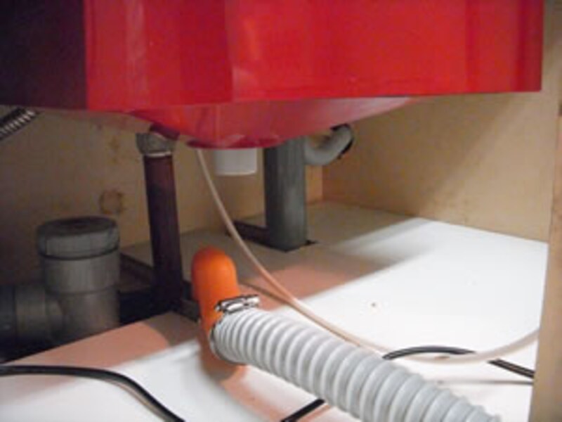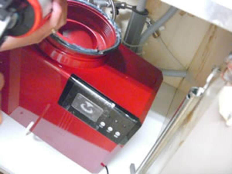 これが新しい改良型シンクピアの本体。従来型はシンクキャビネットの底板上に設置して接続していたが、改良型はシンク排水口にぶら下げる方式となった。