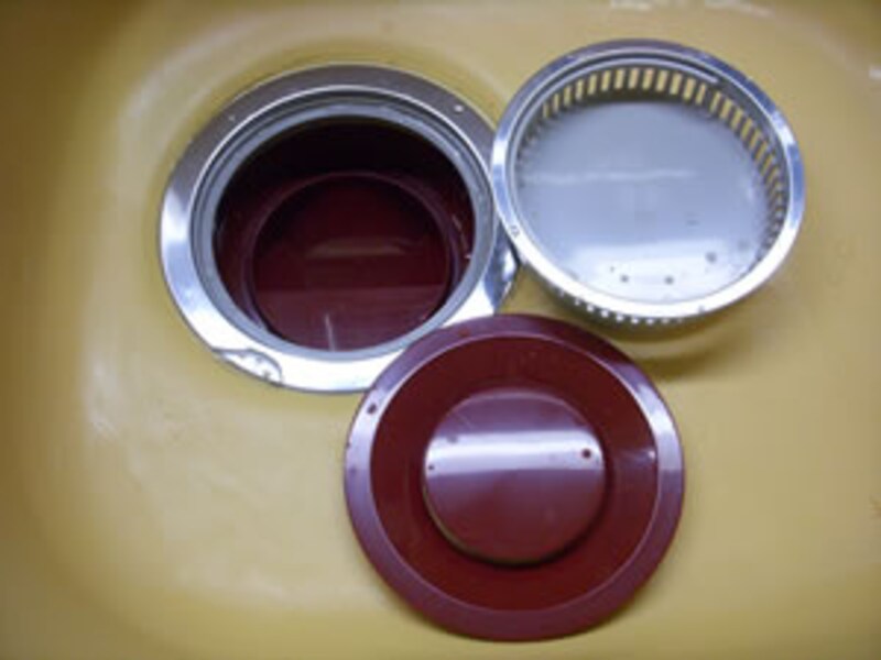 本体のレッドと同色のふたと、強度を増すためフランジにステンレスが取付けられたトラップごみ受け。