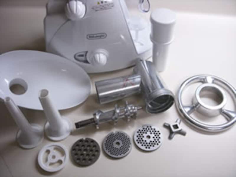 スーパーミンサーとソーセージメーカーの全アタッチメントパーツ。