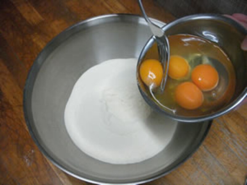 フォークで卵をつぶしながら混ぜ合わせる。うどんのように捏ねるのではなく、万遍なくほぐす。