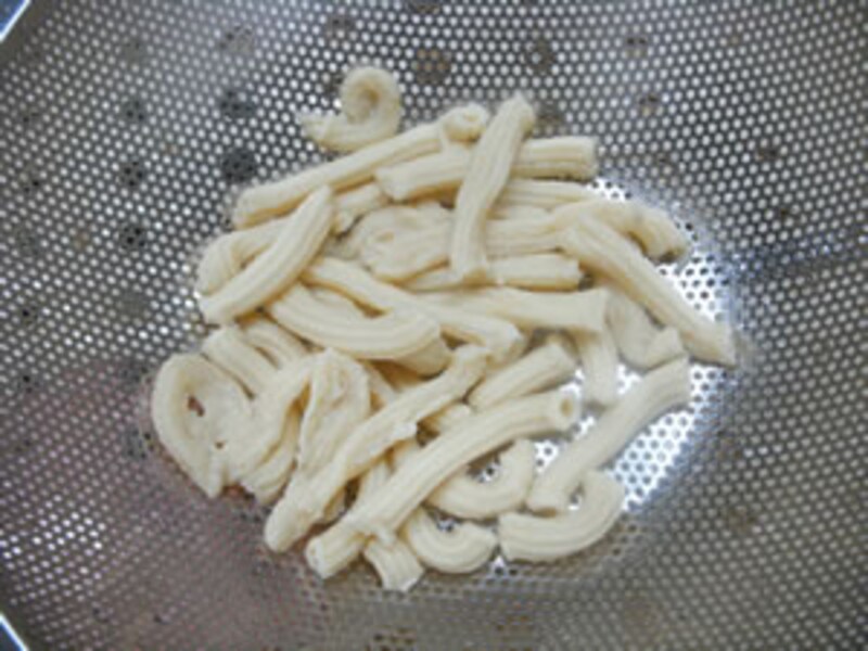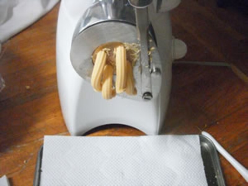 押し出されて出てきたパスタは、くっつきやすいので重ならないようにキッチンペーパーで受けて広げ、2~3時間乾かしてから熱湯で6分ほど茹でてできあがりです。手づくりのパスタはモチッとした口当たりがして、乾燥パスタとは違います。手づくりパスタのうまみを実感してください。