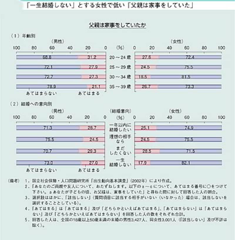 父親が家事をしていたかどうかの記憶は、原体験としてすり込まれます。父親が家事をしていた記憶のない家庭は約30%あり、その子供たちの女性の18%、男性の27%は一生結婚しないと答えています。